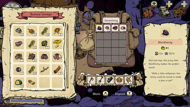 Au fil des jours, on découvre de nouveaux territoires, on rencontre d’autres habitants de la forêt, chacun apportant une quête, un feu de camp pour se réchauffer, ou de nouvelles recettes de fabrication. Dans le terrier, la restauration des meubles débloque progressivement des activités comme la cuisine, le tricot ou la menuiserie, élargissant ainsi les possibilités de jeu.