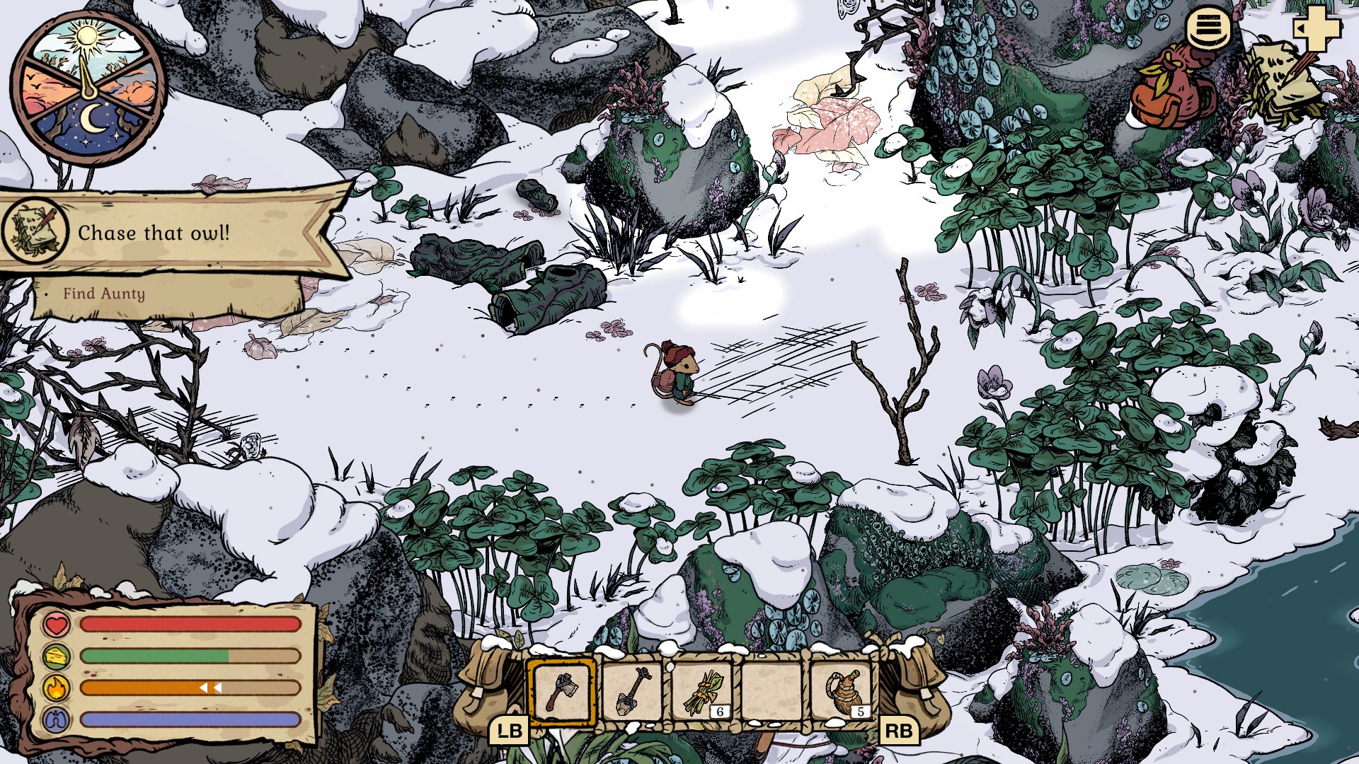 Derrière son univers adorable se cache un jeu étonnamment contraignant, où la moindre sortie du terrier devient une épreuve de patience. La résistance au froid, ridiculement faible au début, oblige à faire demi-tour toutes les quelques minutes, et l’inventaire minuscule limite drastiquement la progression. Ces contraintes, cumulées, finissent par donner l’impression que la durée de vie du jeu est artificiellement prolongée, nous forçant à avancer à pas de souris (littéralement) et à répéter sans cesse les mêmes actions avant d’explorer de nouvelles zones. À cela s’ajoute une ergonomie clairement pensée pour la souris et mal adaptée à la manette : les clics imprécis font souvent sélectionner le mauvais objet ou le mauvais meuble, et l’impossibilité d’organiser son inventaire complique inutilement la gestion. On se retrouve parfois à déplacer manuellement un item dans la partie visible du sac juste pour pouvoir l’utiliser, ce qui casse inutilement le rythme.